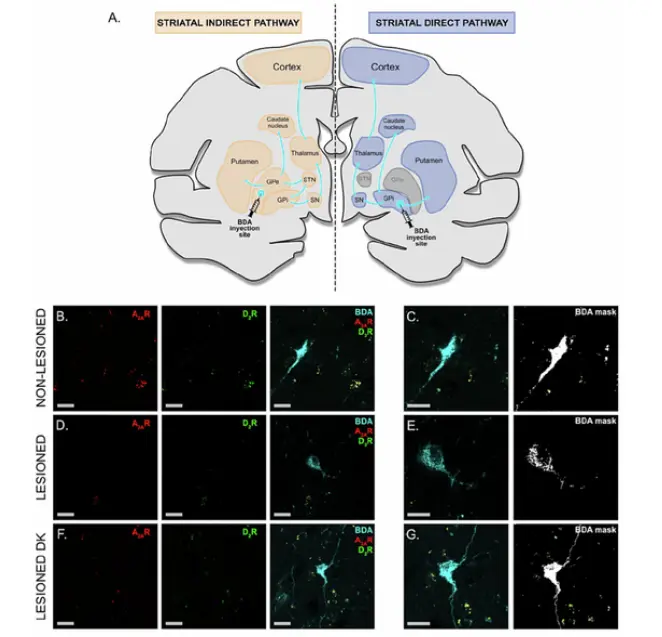 They demonstrate a high prevalence of dopamine D2 receptors interacting with adenosine A2A receptors in striatal medium spiny neurons of both mouse and non-human primate models.