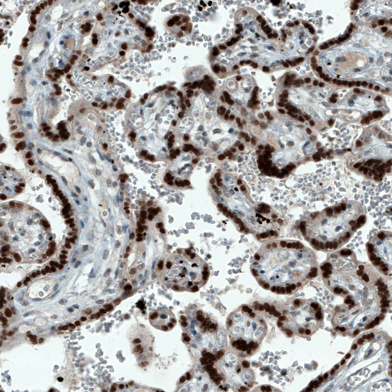 Immunohistochemistry analysis in human placenta and tonsil tissues using AMAb90909 antibody. Corresponding ATF3 RNA-seq data are presented for the same tissues.