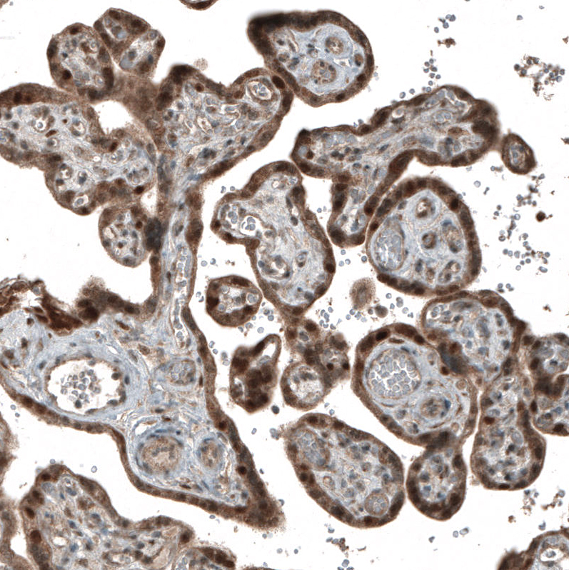 Immunohistochemistry analysis in human placenta and kidney tissues using AMAb91497 antibody. Corresponding CDK2 RNA-seq data are presented for the same tissues.