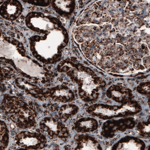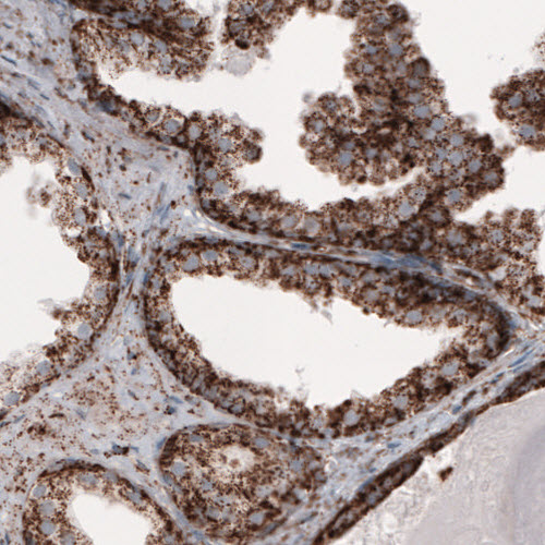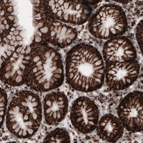 Immunohistochemical staining of human stomach shows strong cytoplasmic immunoreactivity in glandular epithelium cells.