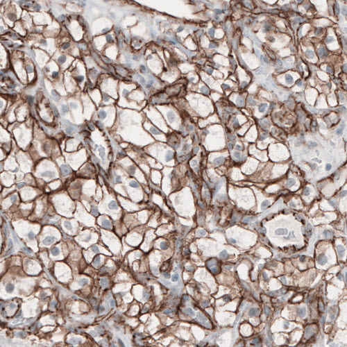Immunohistochemical staining of human small intestine shows strong membranous immunoreactivity in the epithelial cells.