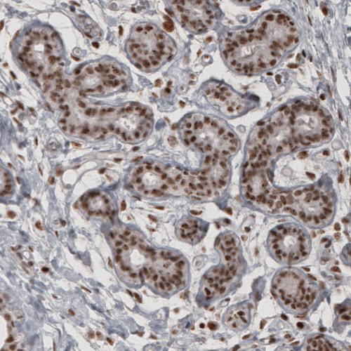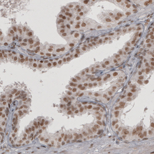 Immunohistochemical staining of human cervix shows moderate nuclear immunoreactivity in epithelial and underlying connective tissue cells.
