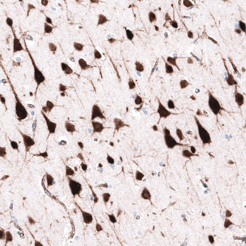Immunohistochemistry analysis in human cerebral cortex and liver tissues using AMAb92028 antibody. Corresponding ELAVL2 RNA-seq data are presented for the same tissues.