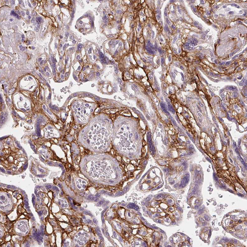 Immunohistochemistry analysis in human placenta and liver tissues using AMAb90585 antibody. Corresponding FBN1 RNA-seq data are presented for the same tissues.