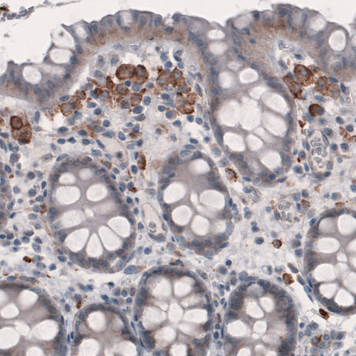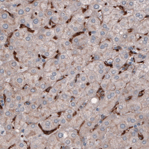 Immunohistochemical staining of human lymph node shows strong positivity in a subset of lymphoid cells.