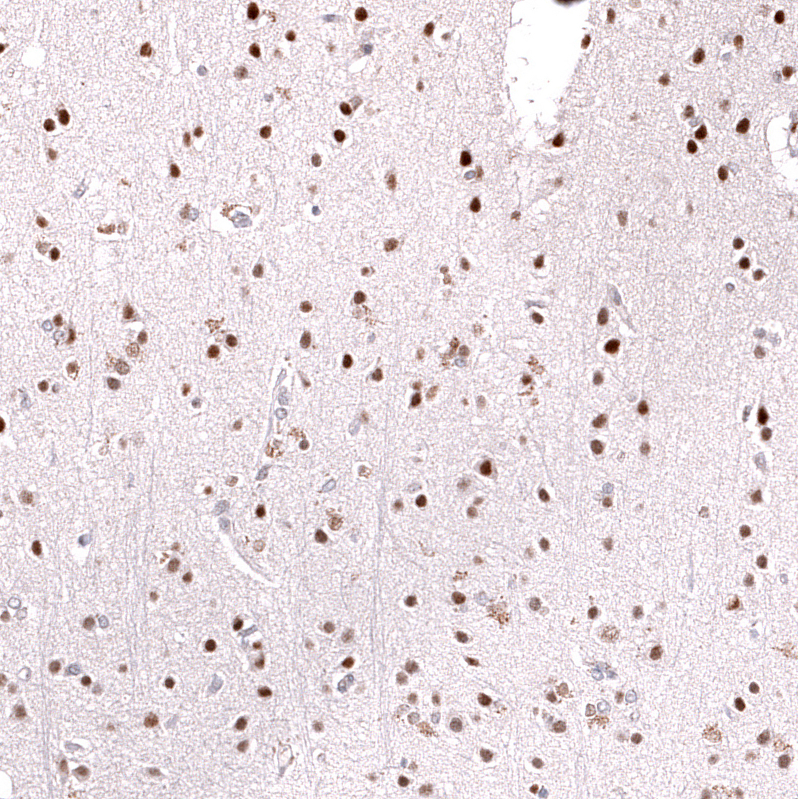 Immunohistochemical staining of human anaplastic oligodendroglioma shows strong nuclear positivity in tumor cells.