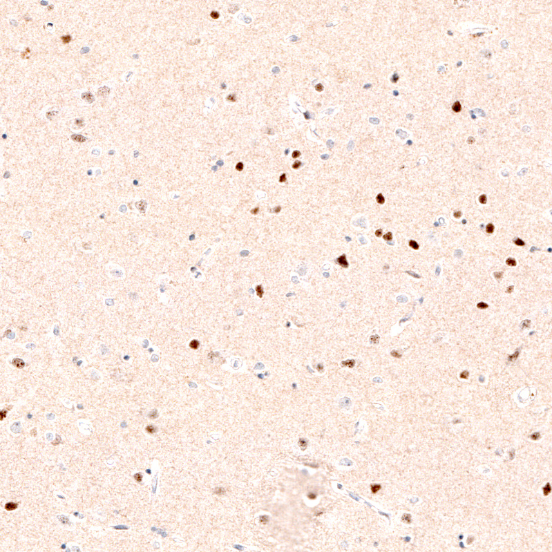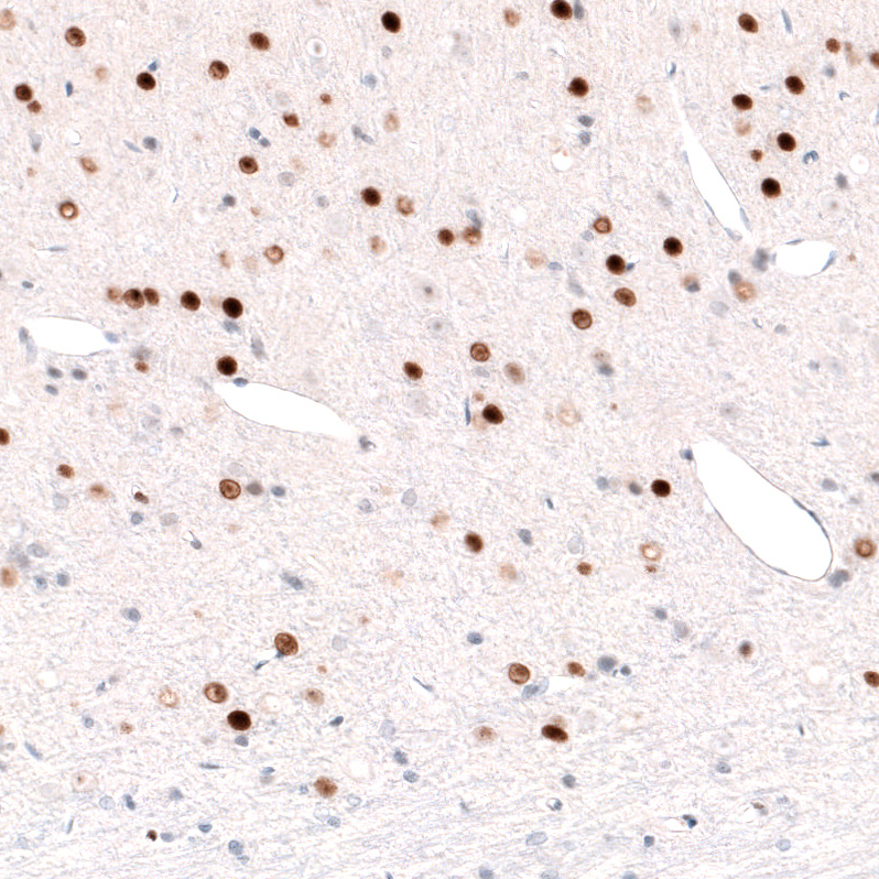 Immunohistochemical staining of rat brain shows strong nuclear positivity in layer 6 cortical neurons, as well as in neurons in caudato-putamen.