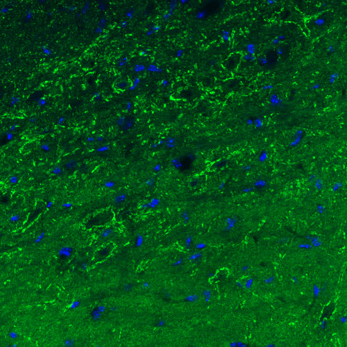 Immunohistochemical staining of rat globus pallidus shows strong immunoreactivity in GABAergic neural fibers.