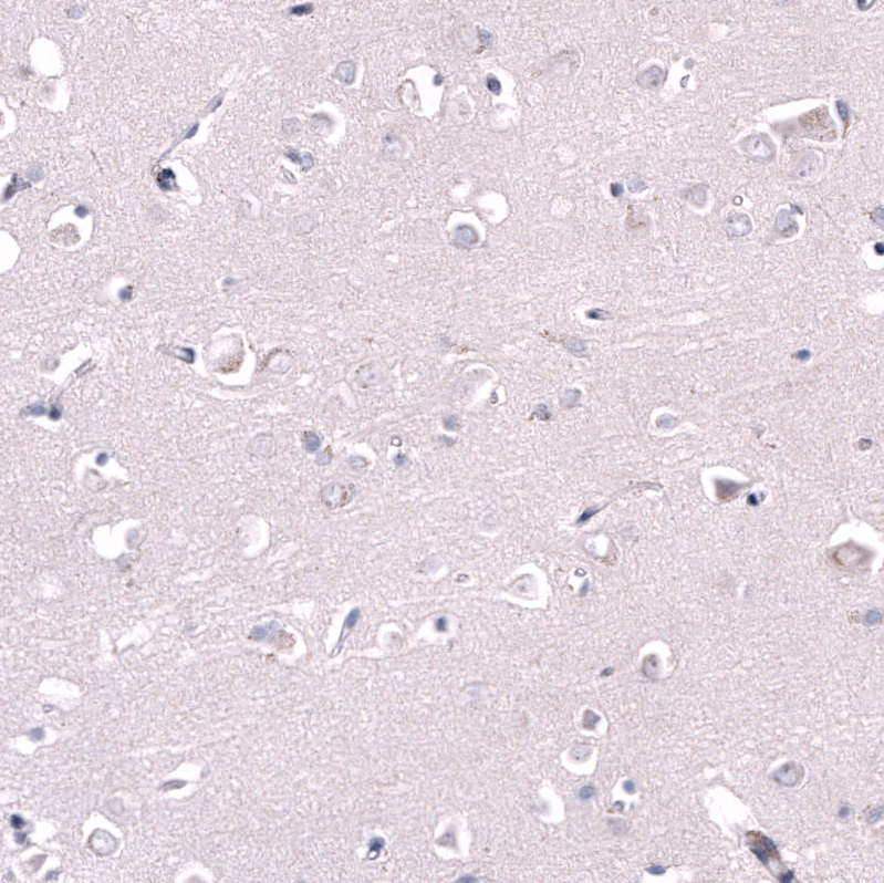 Immunohistochemical staining of rat caudate nucleus shows moderate to strong positivity in neuronal processes.
