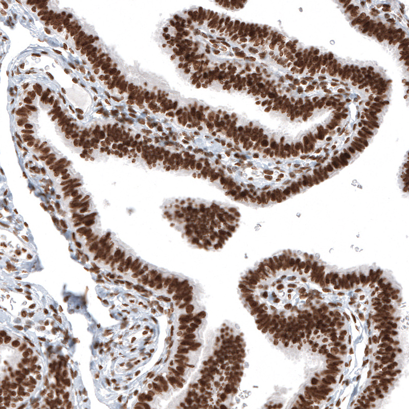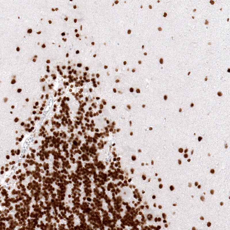 Immunohistochemical staining of human tonsil shows strong nuclear immunoreactivity in lymphoid cells.