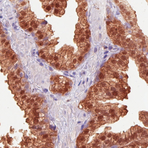 Immunohistochemical staining of human kidney shows strong positivity in a subset of renal tubules.