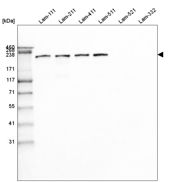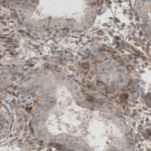 Immunohistochemical staining of human placenta shows moderate immunoreactivity in basement membrane of trophoblast and in endothelium.