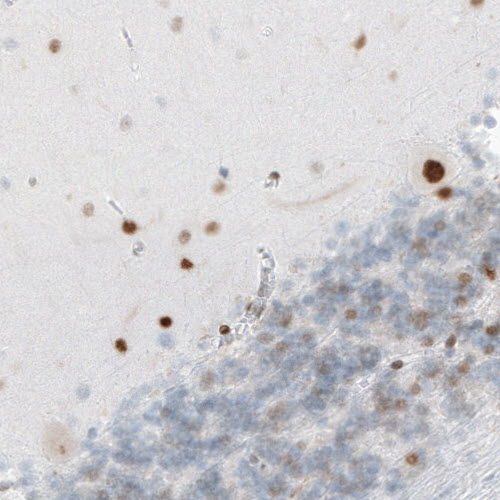 Immunohistochemical staining of human cerebral cortex shows nuclear immunoreactivity in a subset of neurons.