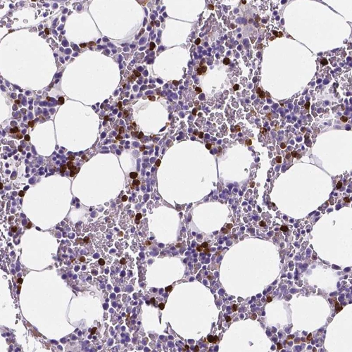 Immunohistochemistry analysis in human bone marrow and endometrium tissues using AMAb90805 antibody. Corresponding MMP9 RNA-seq data are presented for the same tissues.