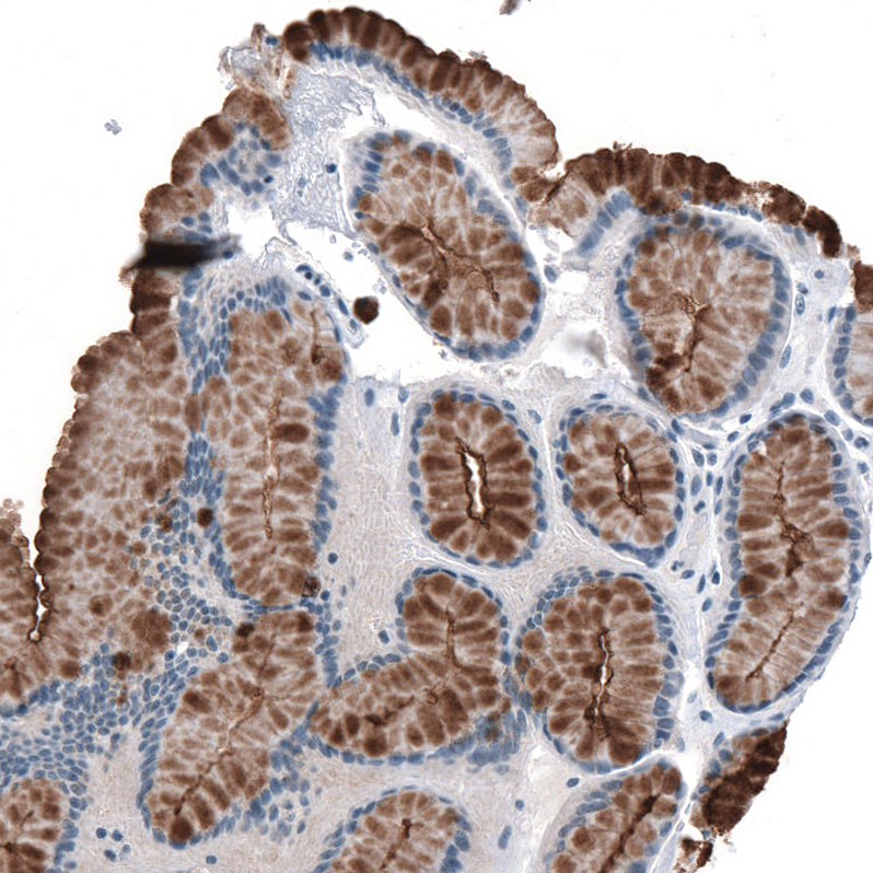 Immunohistochemistry analysis in human stomach and liver tissues using AMAb91533 antibody. Corresponding MUC1 RNA-seq data are presented for the same tissues.