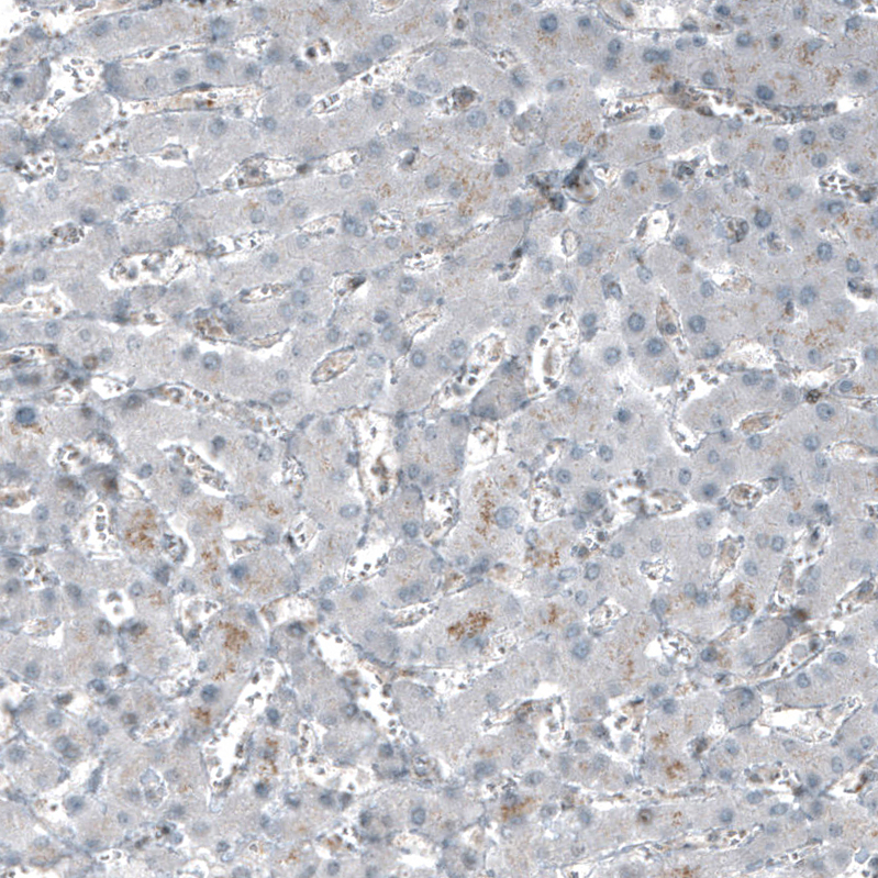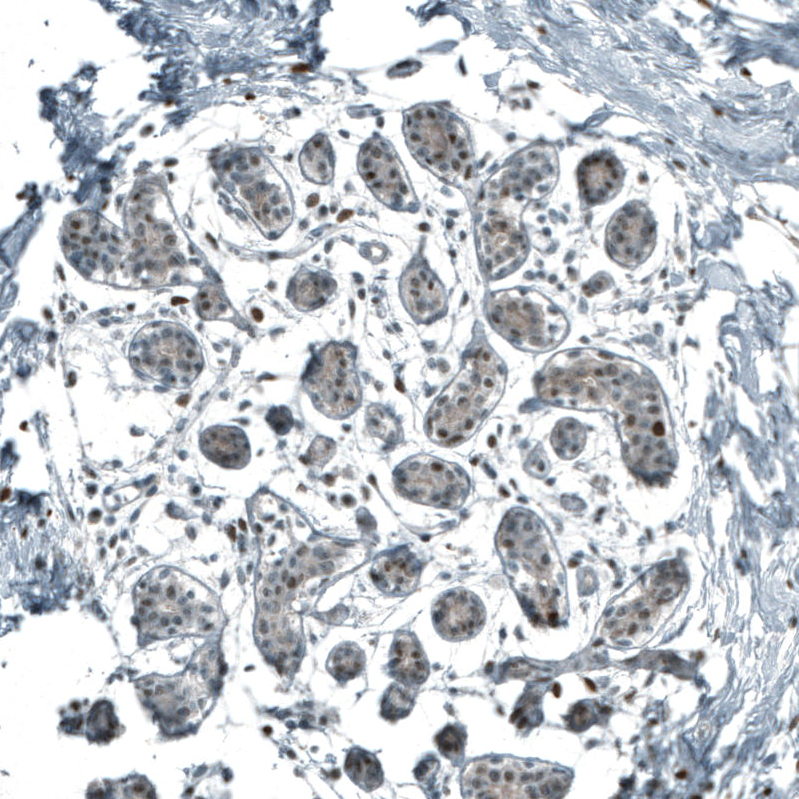 Immunohistochemical staining of human adrenal gland shows moderate nuclear positivity in glandular cells.