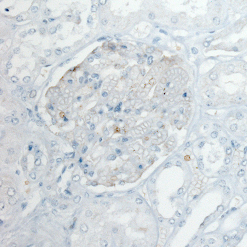 Immunohistochemical staining of human kidney (idiopathic membranous nephropathy) shows strong membranous positivity in cells in glomeruli.