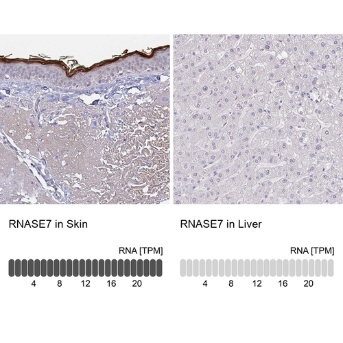 Immunohistochemistry analysis in human skin and liver tissues using AMAb90583 antibody. Corresponding RNASE7 RNA-seq data are presented for the same tissues.