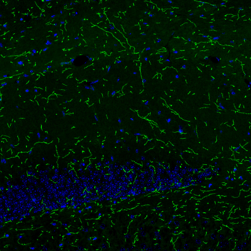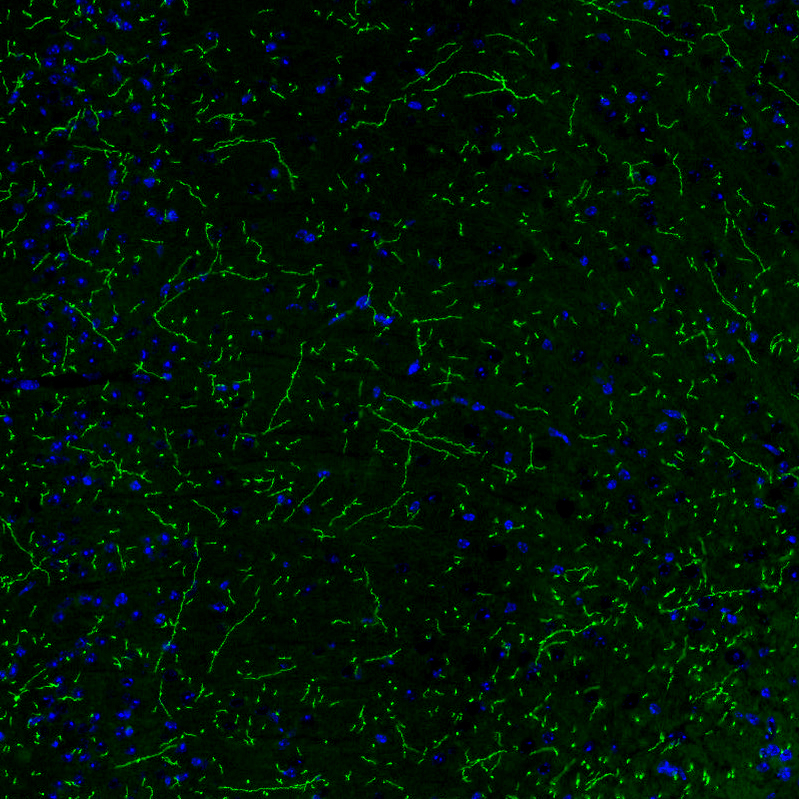 Immunofluorescence staining of rat pons shows strong positivity in noradrenalne neurons in the locus coeruleus.