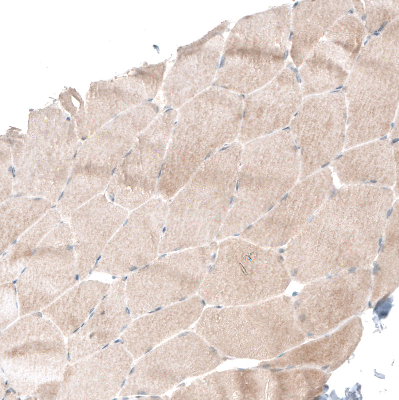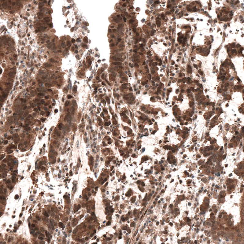 Immunohistochemical staining of human prostate shows moderate nuclear and cytoplasmic positivity in glandular cells.