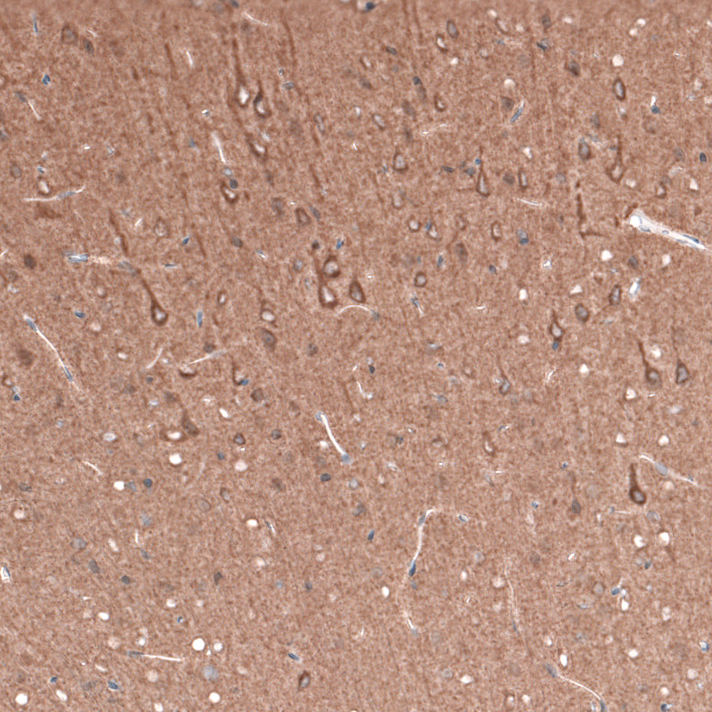 Immunohistochemical staining of human cerebral cortex shows strong positivity in neuropil as well as in neurons.
