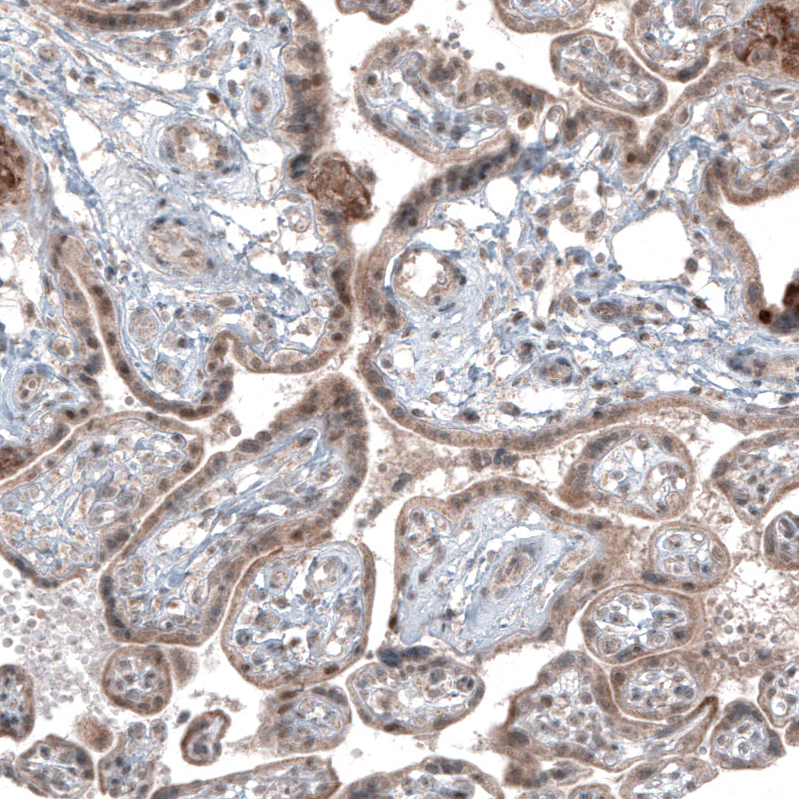 Immunohistochemical staining of human testis shows moderate cytoplasmic positivity in cells in seminiferous ducts.