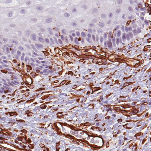 Immunohistochemical staining of human rectum shows strong positivity in mesenchymal and lymphoid cells.