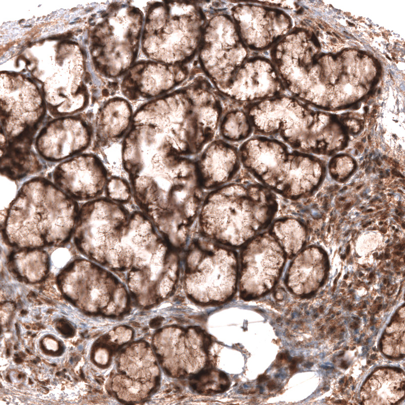 Immunohistochemical staining of human placenta shows strong cytoplasmic positivity in trophoblastic cells.