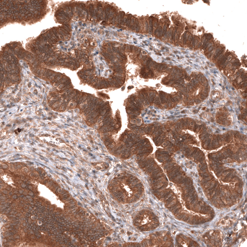 Immunohistochemical staining of human anaplastic oligodendroglioma shows strong cytoplasmic positivity in tumor cells.