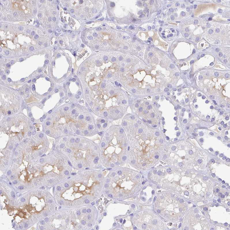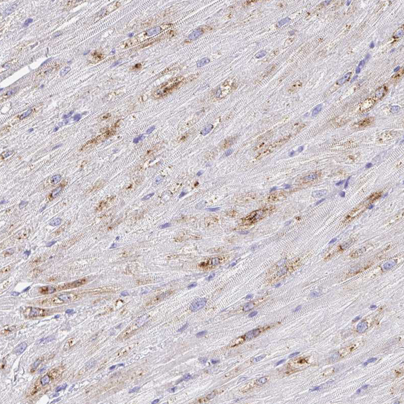 Immunohistochemical staining of human Liver cancer shows moderate extracellular space positivity in tumor cells.
