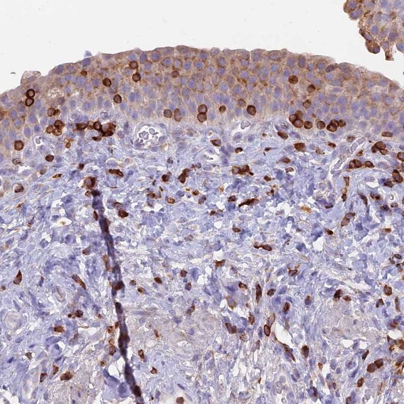 Immunohistochemical staining of human tonsil shows strong cytoplasmic positivity in non-germinal center cells.