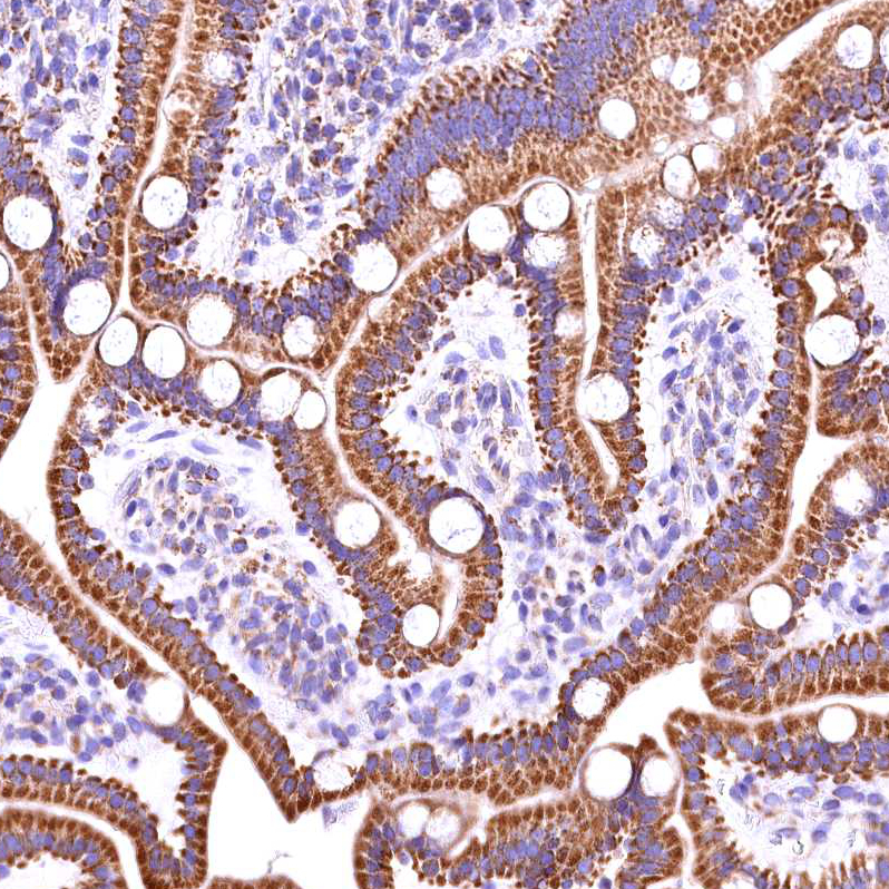 Immunohistochemical staining of human liver shows strong granular cytoplasmic positivity in hepatocytes.
