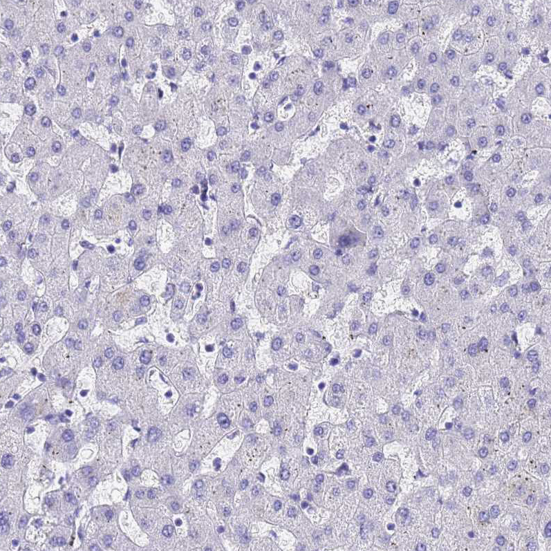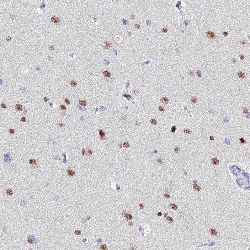 Immunohistochemical staining of human cerebellum shows moderate nuclear positivity in Purkinje cells.