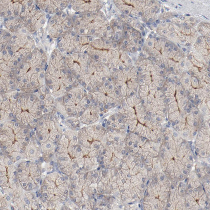Immunohistochemical staining of human Prostate shows moderate membranous positivity in glandular cells.