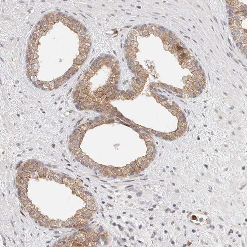 Immunohistochemical staining of human epididymis shows strong membranous positivity in glandular cells.