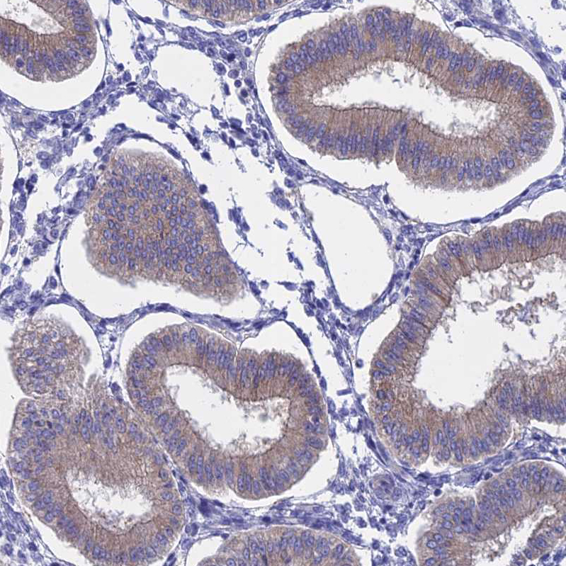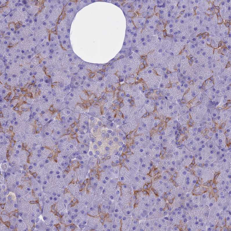 Immunohistochemical staining of human duodenum shows moderate membranous and cytoplasmic positivity in glandular cells.