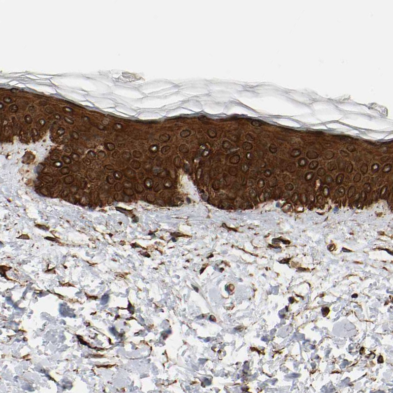Immunohistochemistry analysis in human skin and liver tissues using HPA004145 antibody. Corresponding AHNAK2 RNA-seq data are presented for the same tissues.