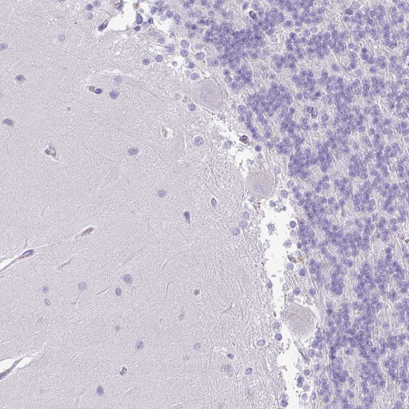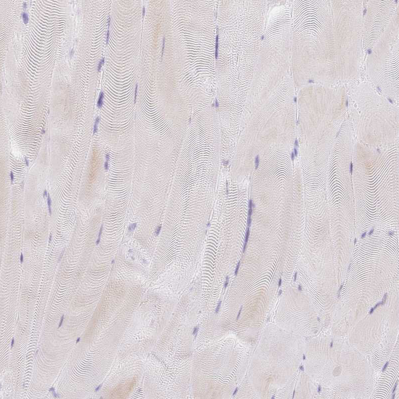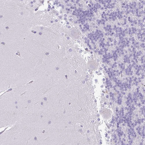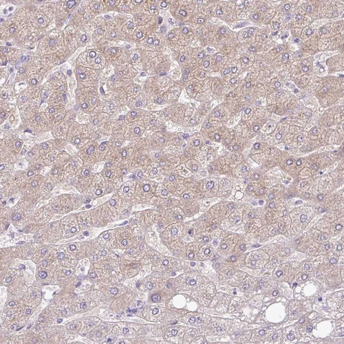 Immunohistochemical staining of human kidney shows moderate cytoplasmic positivity in cells in tubules.