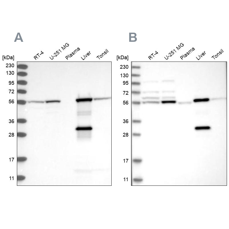 Immunohistochemistry analysis in human liver and tonsil tissues using Anti-ALDH6A1 antibody. Corresponding ALDH6A1 RNA-seq data are presented for the same tissues.