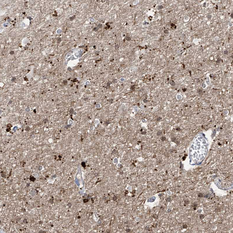 Immunohistochemical staining of human cerebral cortex shows strong cytoplasmic granular positivity in neurons.