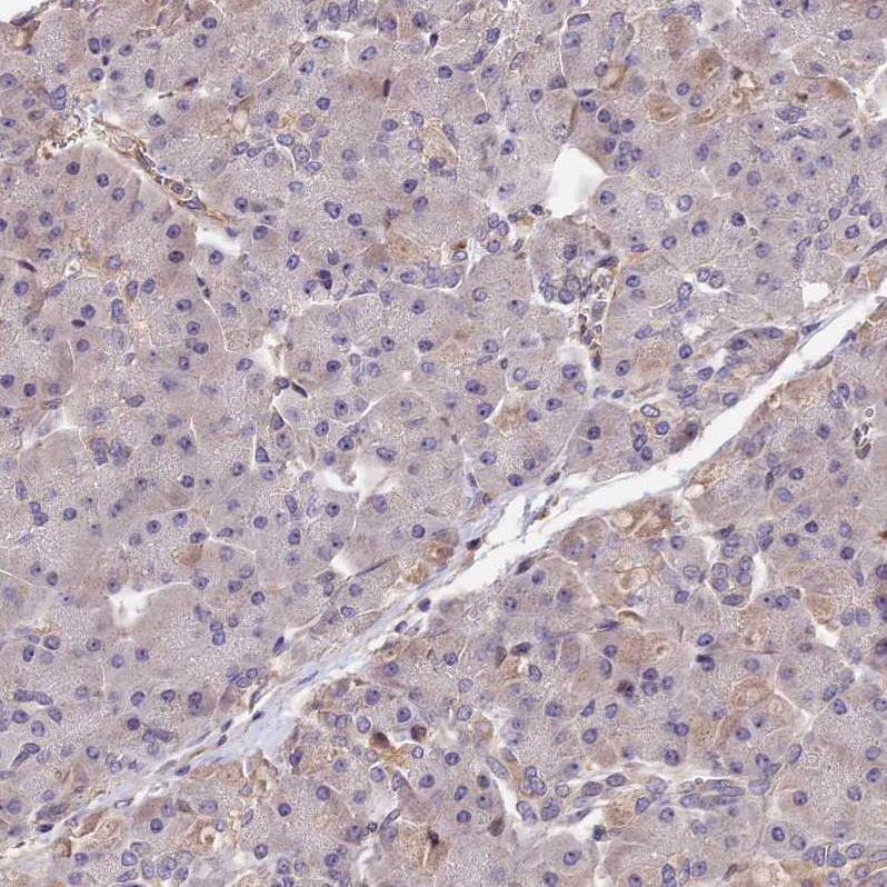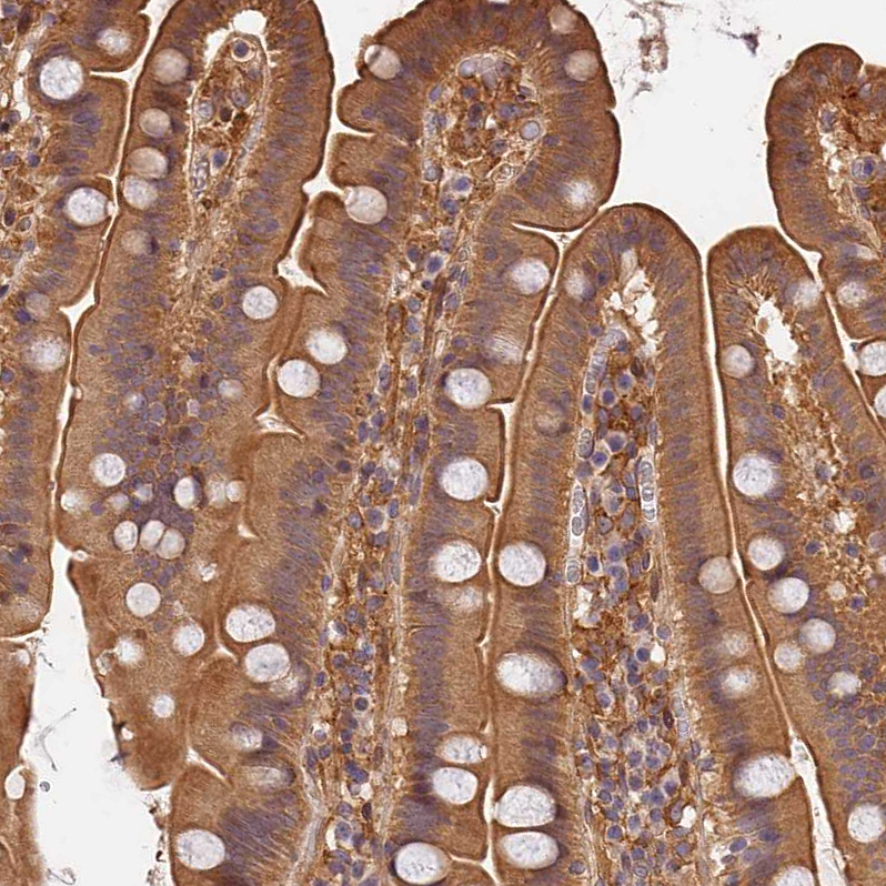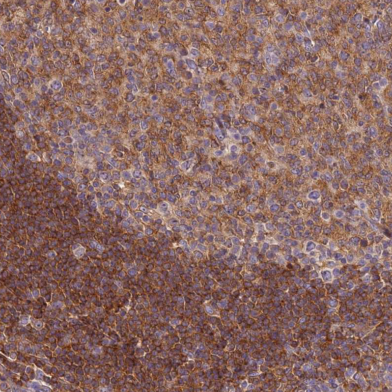 Immunohistochemical staining of human placenta shows strong cytoplasmic positivity in trophoblastic cells.