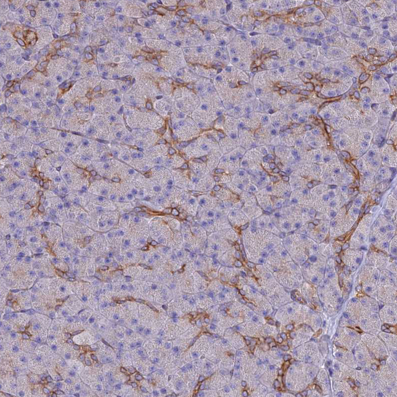 Immunohistochemical staining of human testis shows weak to moderate cytoplasmic positivity in cells in seminiferous ducts.