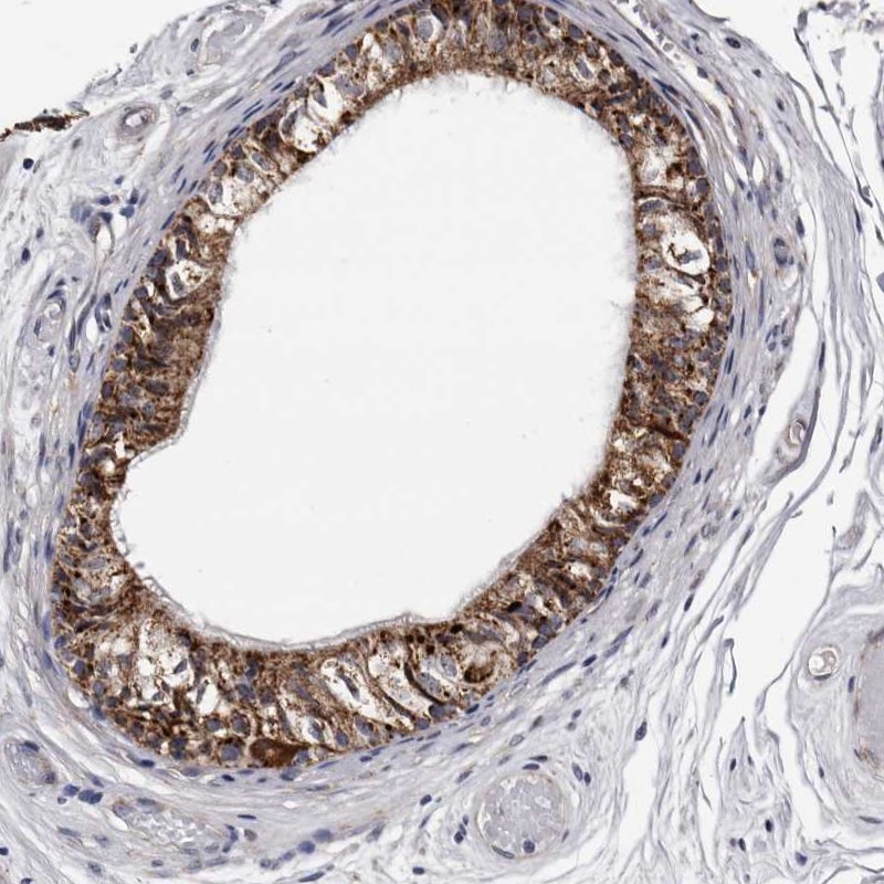 Immunohistochemistry analysis in human epididymis and colon tissues using Anti-ARMCX2 antibody. Corresponding ARMCX2 RNA-seq data are presented for the same tissues.