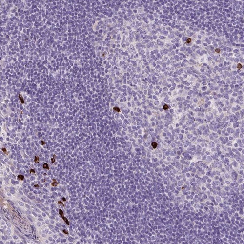 Immunohistochemical staining of human tonsil shows strong cytoplasmic positivity in a subset of germinal and non-germinal center cells.