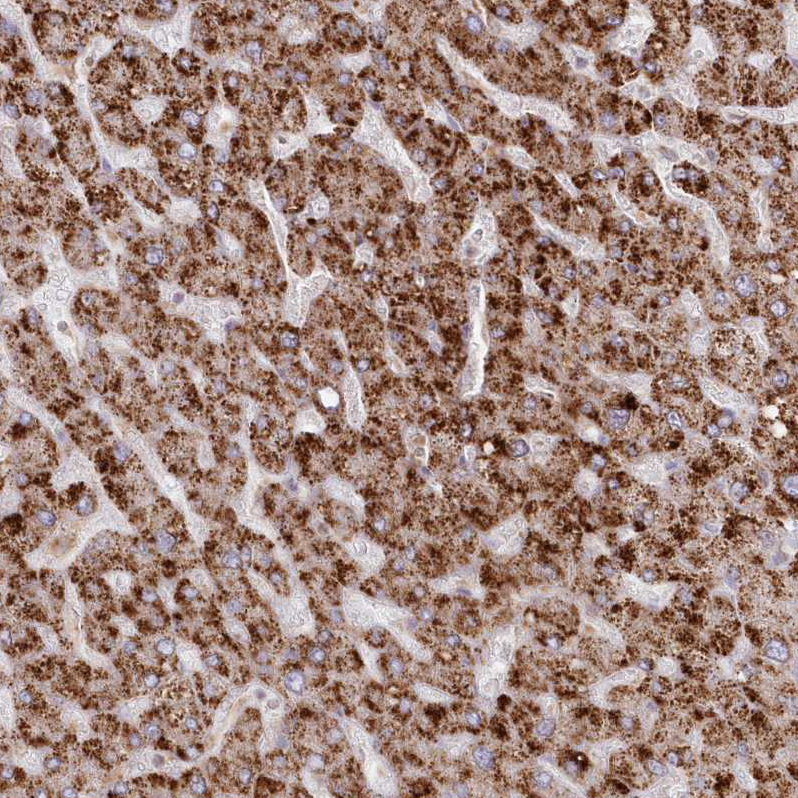 Immunohistochemical staining of human kidney shows strong cytoplasmic positivity in cells in tubules.