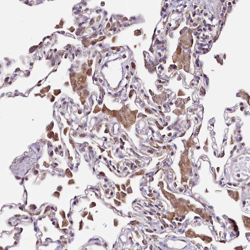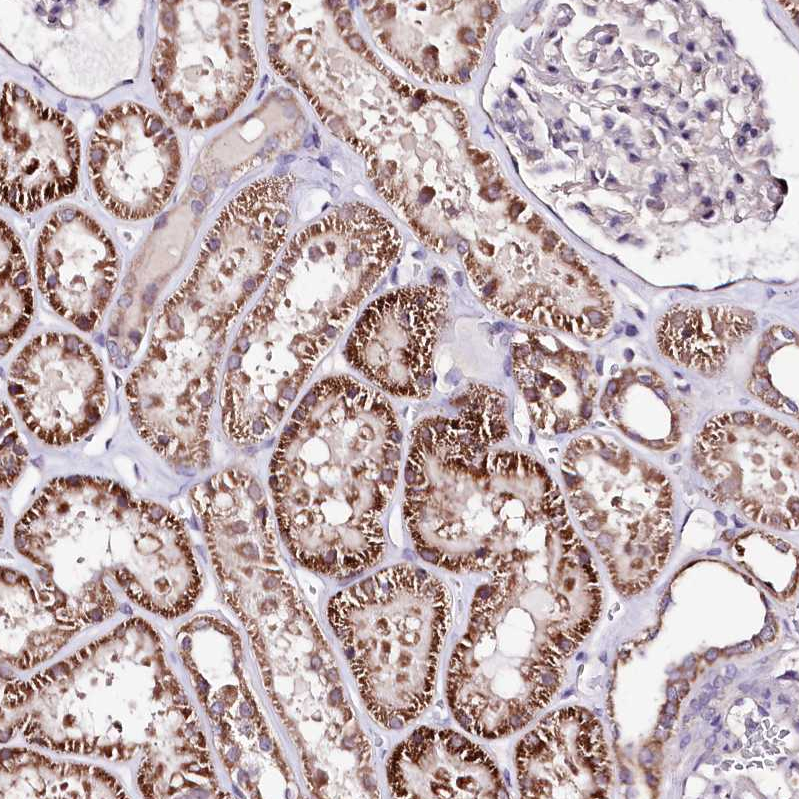 Immunohistochemical staining of human liver shows strong cytoplasmic positivity in hepatocytes.