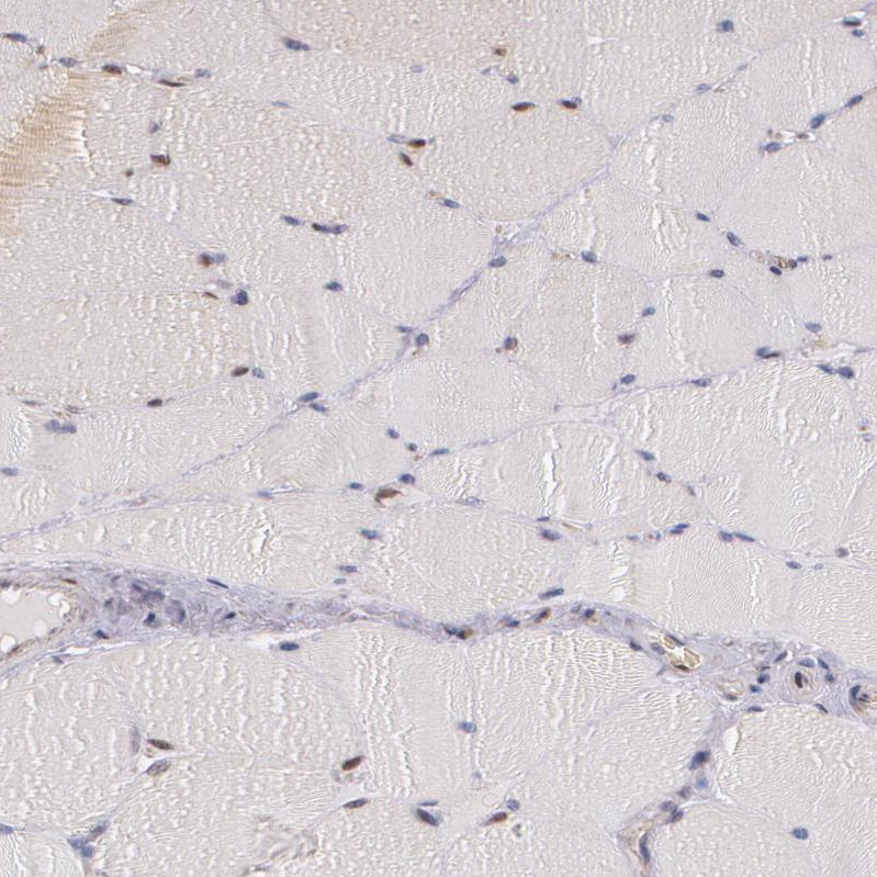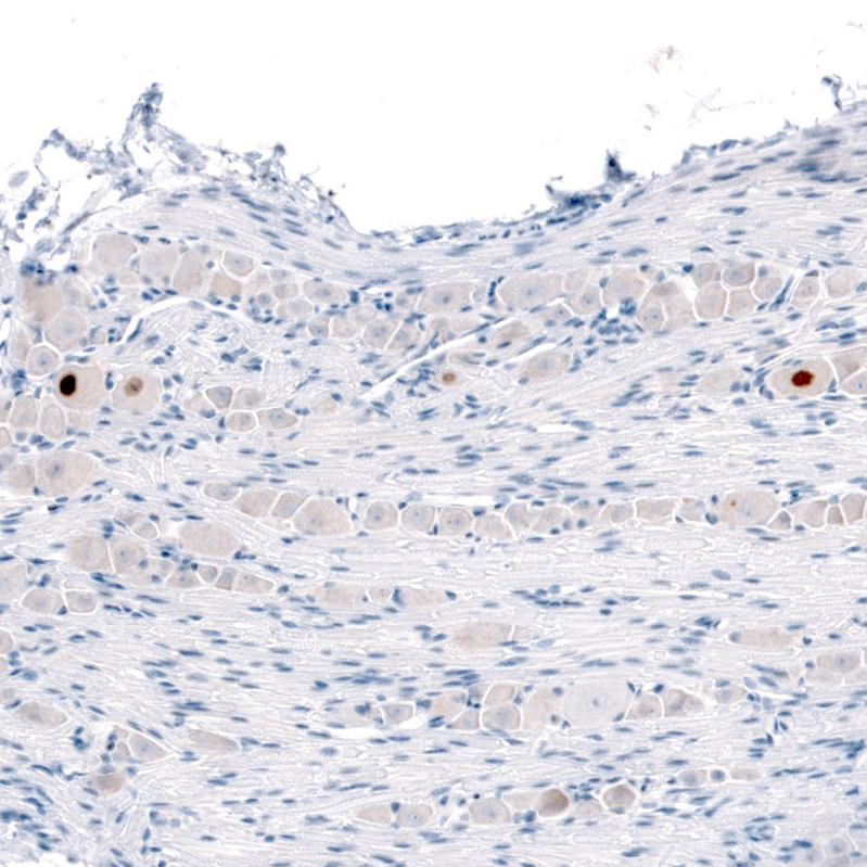 Immunohistochemical staining of human placenta shows strong nuclear positivity in trophoblastic cells with weak cytoplasmic positivity.