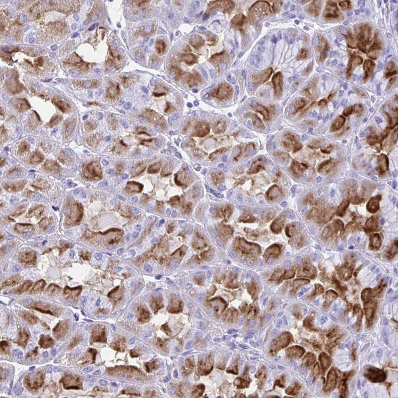 Immunohistochemistry analysis in human stomach and liver tissues using HPA045400 antibody. Corresponding ATP4B RNA-seq data are presented for the same tissues.