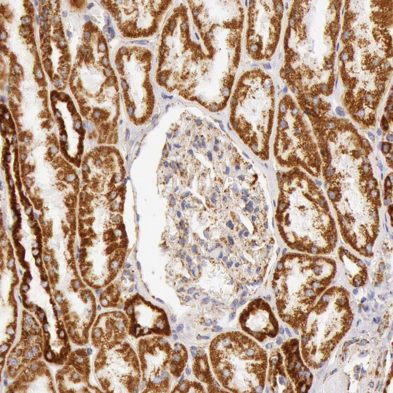 Immunohistochemical staining of human kidney, liver, prostate and small intestine using Anti-ATP5B antibody HPA001520 (A) shows similar protein distribution across tissues to independent antibody HPA001528 (B).