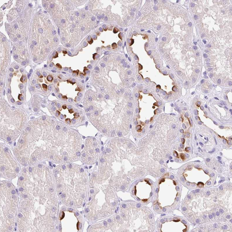 Immunohistochemistry analysis in human kidney and skeletal muscle tissues using HPA064555 antibody. Corresponding ATP6V0A4 RNA-seq data are presented for the same tissues.